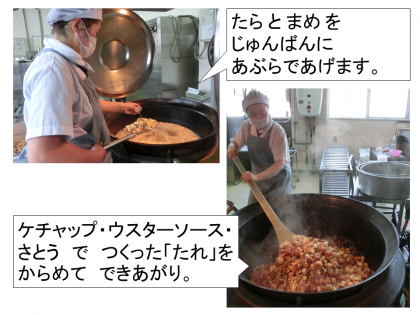 たらと豆を順番に油でカリッと揚げて,ケチャップ・ウスターソース・砂糖でつくったたれをからめて仕上げました。