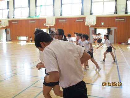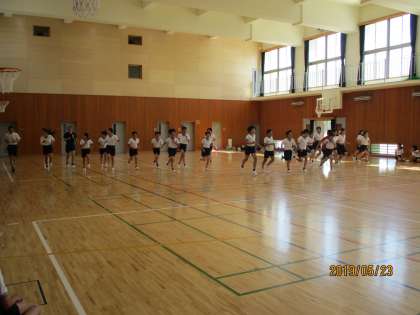 チャレンジ体験の中学生も一緒に走ってくれました。中学生の走り方から,子ども達は