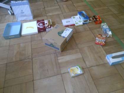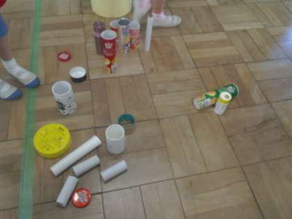集めてきた箱を仲間わけしてみました。箱・筒・ボール(まる)の3つに分けます。子どもたちは,しっかり形の特徴を捉えています。