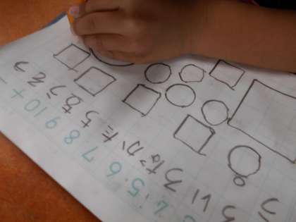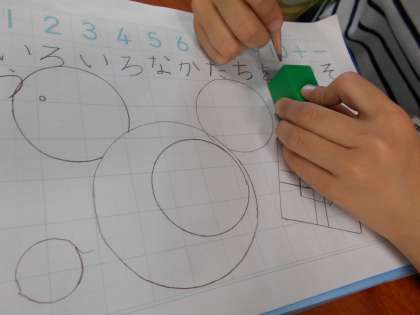 立体の面を写し取り,形の特徴を生かし,絵を描きました。立体図形から平面図形へ。平面になると,○や□になるので,さらに特徴がはっきりしてきます。ですが,1年生にとってこの写し取る作業が難儀です。みんな,真剣です!