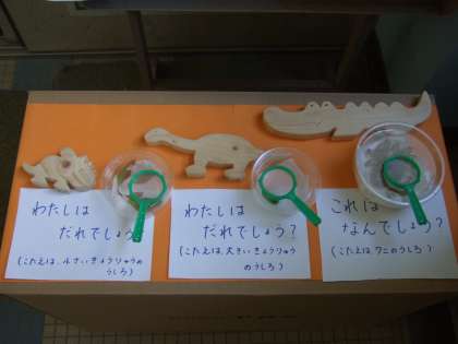 第2理科室の前に,生き物クイズコーナーを設置しています。子どもたちがその時々に飼育している生き物に,興味を持ってもらえたらと思います。先日シュレーゲルアオガエルの卵をもらったので,おたまじゃくしもたくさんいます。地域の方から昨年譲っていただいたメダカも,いろいろな種類がいます。ぜひ見に来てください。