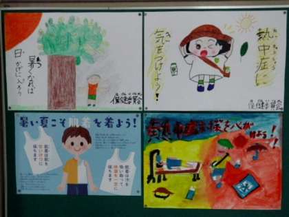 児童保健委員会の今回の発表テーマは,「熱中症」です。外で遊ぶときは,帽子をかぶっていますか?水分補給を忘れずに,暑い日は薄着をしましょう。時々,すずしい場所で休憩するといいですね。体調が悪い時は無理をせず,安全にすごしましょう。