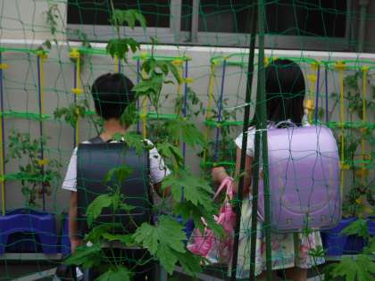 自分のミニトマトの色が変わるのを見逃すまいと, 子ども達はよく見に行っています。