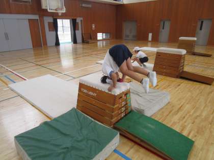 体育科で「跳び箱運動」が始まりました。3年生では横抱え込み跳びや台上前転といったレベルアップした技に挑戦しています。これまでより高い段数を跳べたり,新しい技が出来たりと,子どもたちは意欲的に取り組んでいます。
