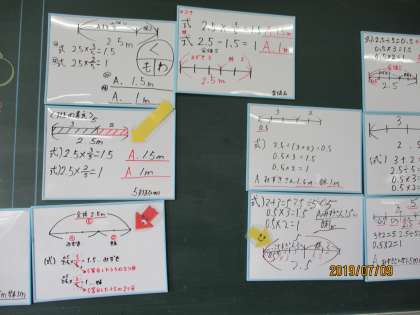 問題の中で,昨日と違う所はどこかを探し,今日使えるアイテムを探します。めあてもスムーズに自分たちで考えられるようになりました。今日は,グループで練りあいをした後,たくさんのグループに自分たちの考えを伝えに行きました。お互いの考えについて,質問したり,アドバイスしたりととても上手になりました。