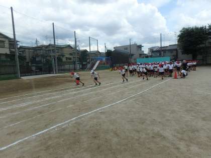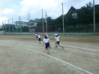 運動会本番は100mですが,カーブの間隔を80m走でつかみ,腕のふり方や視線を意識して全力で走りました。