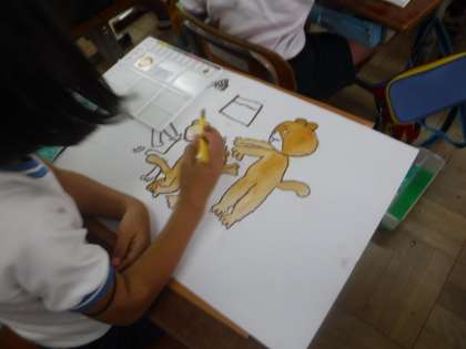 「カステラやさんときんいろのおさかな」には, イタチの親子が登場します。魔法の力で金色のお魚に変身したイタチの子ども達。しかし, そのお魚を狙う人が出てきて・・・子ども達はわくわくハラハラした気持ちを絵で表現しています。
