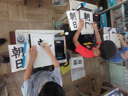 「朝日」を書きました。「朝」と「日」の大きさのバランスに気をつけました。画数が多い漢字は大きく,少ない漢字は小さくすると上手に見えることが分かりました。