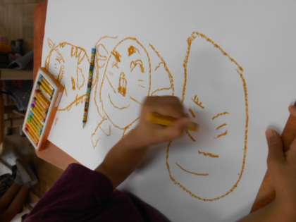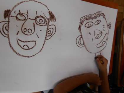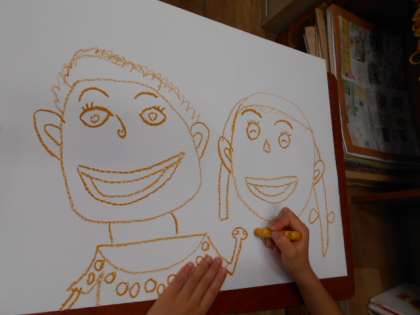 9月16日 敬老の日に向けて,おじいさん・おばあさんの絵をかいています。大好きなおじいちゃん・おばあちゃんを思いうかべながら,下書きをしました。