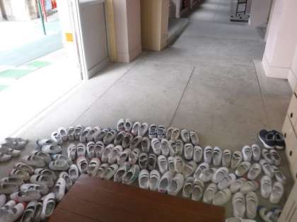 運動会に向けて各クラスで練習を行っています。今日は細かい手の動きやひざの動きを確かめる活動をしました。特別教室に入る前には, しっかり靴も揃えてやる気十分です。