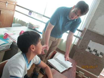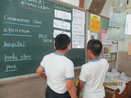 今までに習ったことも,黒板を見ながら一所懸命使おうとしている子ども達です。「集中力ゲーム」では,たくさんの単語を覚えて,グループで協力していました。
