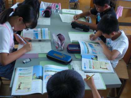 満月の動きを月早見表や方位磁針などを使って,学びました。教室にある月例カレンダーを見ながら,観察を続けて行きます。みさきの家の二日目にちょうど「下弦の月」にあたるため,みんなで観察します。
