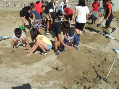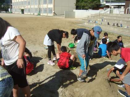 5年生の理科で「流れる水のはたらき」という単元があるのですが,今年は屋外の砂場を使って,実際に川を作り,水を流すという実験をしました。