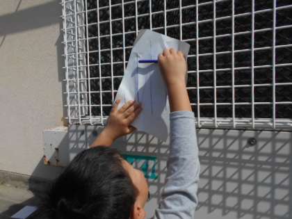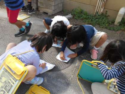 紙とクーピーを持って,身近にある型を写しに出ました。あるわ,あるわ,面白い模様がどんどん出てきました。こんなにあるのかと,驚きました。子どもたちの目は素晴らしい!楽しむ力は天下一品!
