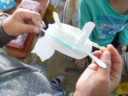 にょきにょき動かして, どんなおもちゃに仕上げるか, 子ども達は思い思いに頭をひねりました。動く仕組みが動物の手になった人や, 踏切になった人, 魚のひれになった人など, 様々なアイディアが出てきました。今度は自分で作ってみてもいいですね。