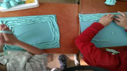 握ったり転がしたりしながら,ねん土のかたまりを細長くしていく子どもたち。