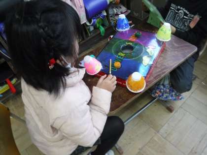 生活科「あそんで ためして くふうして」の学習の最後に, これまで準備してきたオリジナルのゲームやあそびを楽しめるお店を出しました。飛ぶおもちゃを作って, 飛んだ高さを競うゲーム屋さんや, 自分だけの楽器を作って演奏体験ができるお店など, それぞれ工夫をこらしたお店がずらりと並びました。