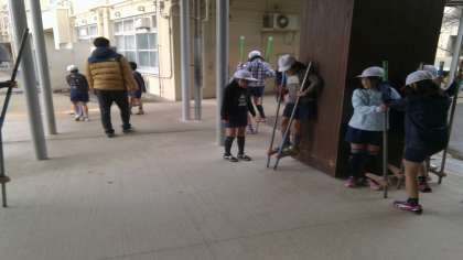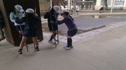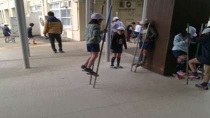 体育「フレアスポーツ」の学習では,竹馬や一輪車などの道具を使っています。