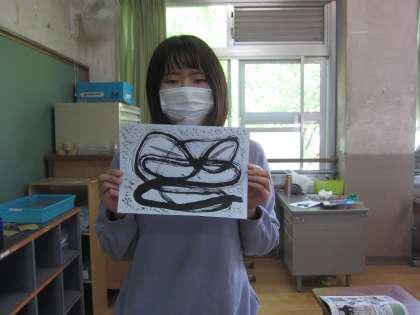 筆でかいた線をもとに,「何に見えるかなぁ」と想像して作品につなげたり,「自分がかきたい」と思った絵を墨で表したり,いろんな表し方があります。