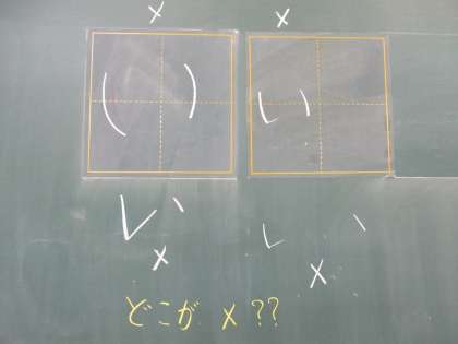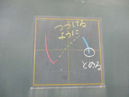 「い」のもじは,2かいでかきます。1かくめ(1かいめでかくところ)のおわりと,2かくめ(2かいめでかくところ)のはじまりを『つなげるようなきもち』でかいてみましょう。1かくめは,すこしまあるく,おわりは2かくめのはじめにむかって,ぴんっとはねましょう。2かくめのおわりは,ぴたっととめるとかっこいいですよ。