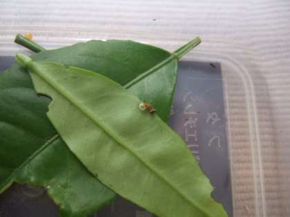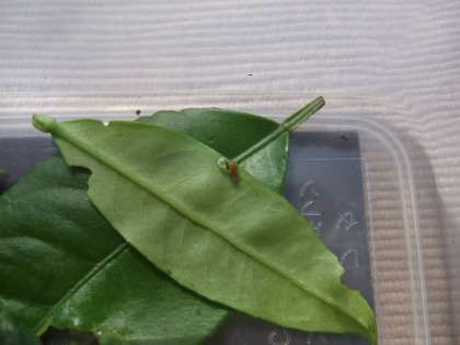みなさんは知ってますか?生まれたばかりのアゲハチョウの幼虫は,自分がさっきまで入っていた卵のカラを食べるんですよ(写真右)。なぜこんなことをするのかはまだよくわかっていないそうです。みなさんはなぜだと思いますか?