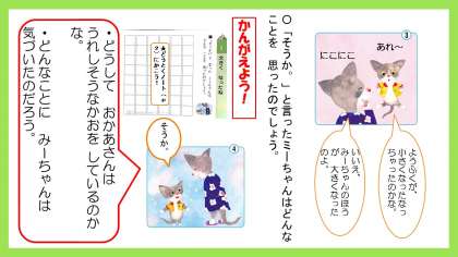 みーちゃんの体のせいちょうをとおして,大きくなることについて考えます。体のせいちょうと心のせいちょう,みんなはどんなときに,「大きくせいちょうしたな〜。」と思いますか?どうとくノートに自分の思いを書いてみよう。