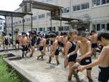 泥の田んぼを見て,水着に着替えた子どもたちは