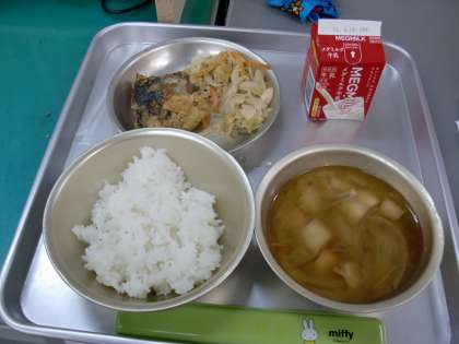 本日の給食は, ごはん,牛乳,さわらのたつたあげ,キャベツのごま煮,みそ汁でした。「キャベツのごま煮」にはねりごまを使い,いつもの“ごま煮”とは違ったクリーミーな味わいになっており,みそ汁には京北の赤みそを使っています。