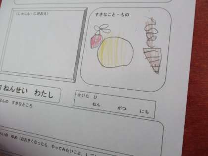 と伝えると,子ども達はびっくりです。今日は,お名前と好きなものを絵にして書きました。