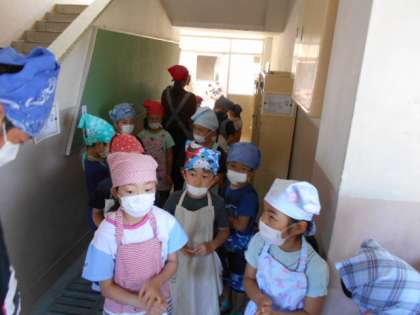 お家から持ってきたエプロンと帽子(三角巾)をつけて,給食室へ。しっかり手洗いをして,アルコール消毒もして,衛生管理はばっちりです。ひさしぶりの給食です。