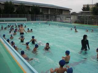 初めの週は低水位(写真左)ということもあり,「かにさん」「わにさん」「せんたくき」など手や足で歩くものを中心に水慣れしましたが,13日の週からは水位が上がったため(写真右),「浮く」学習(「だるまうき」「大文字」「ひきふね」(友だちにひっぱってもらう))も始めました。
