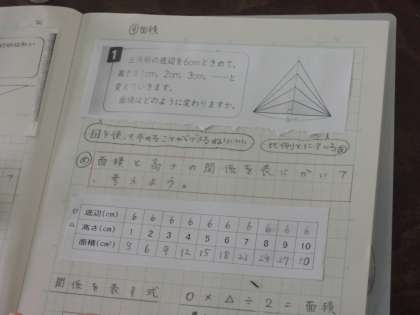 算数科の「面積」の学習では,三角形の底辺を6cmときめて,高さを1cm,2cmと変えていけば,面積はどのように変わるのかを調べました。