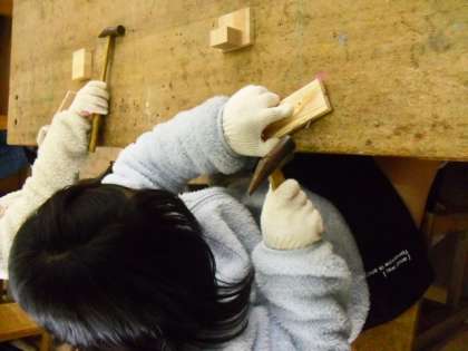 初めて使う金づちにドキドキ・ワクワク。最初はおそるおそる釘を打ちこんでおり,釘が曲がってしまうなど悪戦苦闘。しかし,何度も取り組むと次第にまっすぐ打てるようになり,木片のいろいろな場所に釘を打てるようになりました。