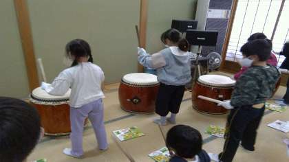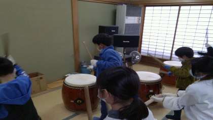 これまでに音楽の授業で全国各地のお囃子を鑑賞してきました。そこで今日は実際に長胴太鼓を叩いてみました。鑑賞していた神田囃子で流れていた太鼓のリズムを叩いたり,そのほかのリズムを叩いたりして太鼓に慣れ親しみました。子どもたちからは太鼓を叩く中で「むずかしいな。」「よっしゃ。」などの声があがっていました。