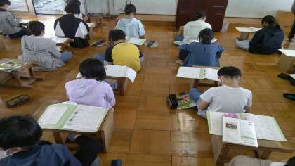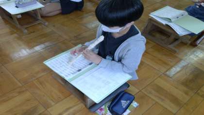 リコーダーの演奏の代わりに,楽譜を見ながら,指の動かし方を練習しています。