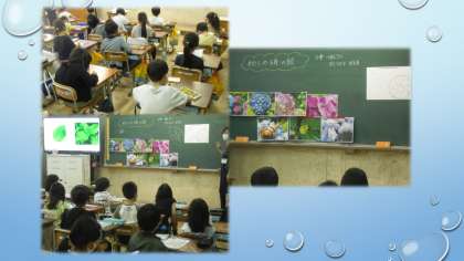 図画工作で「わたしの6月の絵」に取組んでいます。アジサイを虫眼鏡でのぞき込んでいる様子を絵に表します。全体の構図が決まったら,花びら1枚1枚の様子や葉っぱの形などを確認して進んでいきました。