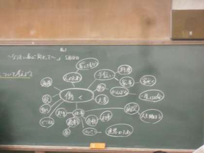 働くって大変そう!誰のために働くのかな?人のため,みんなが思うことをどんどん言葉にしてつなげていき,イメージマップが完成しました。