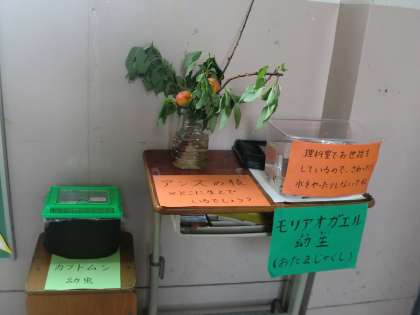 4年生の廊下の一角に,理科コーナーがあります。(「オタマジャクシ」「カブトムシの幼虫」「杏の木の枝」)じっと生物の様子を観察している子や「ほんまにかわいいな。」と友達と話しながら見る子など多くの子が足を止めています。日々の暮らしの中に小さくとも活き活きと生きようとする生命の息吹を子どもたちは感じているようです。