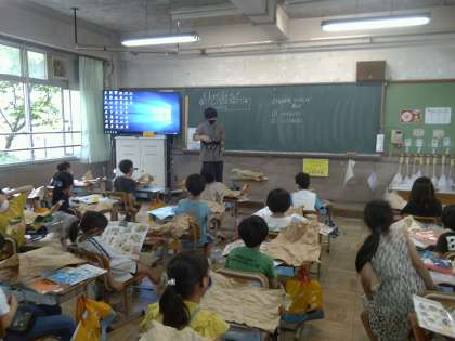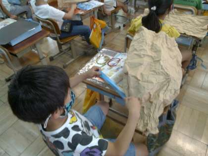 どのクラスでもダイナミックな作品が仕上がってきました。大きな袋を机一杯に広げて活動していました。