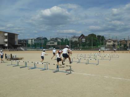 子どもたちはハードルの学習が楽しみで,熱心に取り組んでいます。前回よりもタイムが上がるように,何度も繰り返し練習していました。怖がらずに勢いよく走ったり,ハードルに当たっても止まらずに走り続けたりする姿に成長を感じます。こまめに水分補給をし,日陰で休む時間も取りながら進めています。