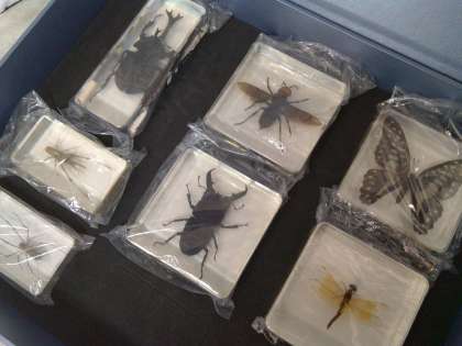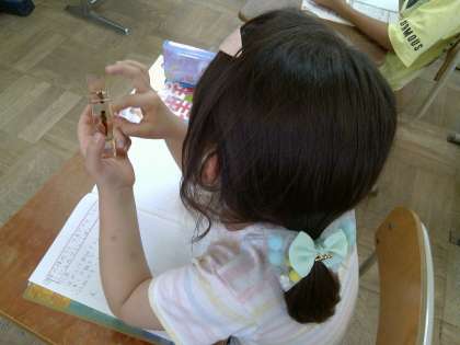 これまでにも見たことのある「カブトムシ」や「トンボ」,「ハチ」ですが,動かない標本になった虫をじっくりと見るということで,子ども達はおおはしゃぎ。