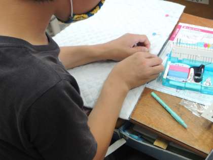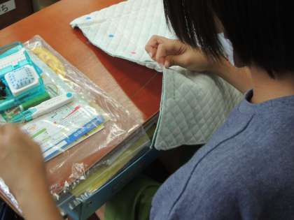 5年生で学習した,玉どめ・玉むすびや本返しぬいの縫い方を思い出しながらナップザックを作っています。