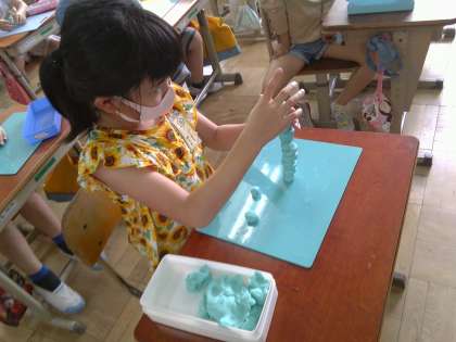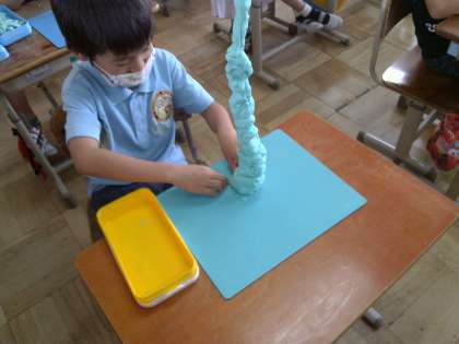 粘土遊びをしました。5組の様子です。粘土で作品を作るだけでなく,高く積むためにはどうしたらいいかや,きれいな丸を作るにはどうしたらいいかを考えてみました。