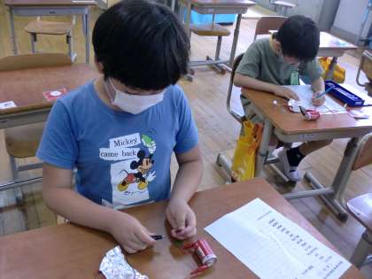 豆電球の電気がついた時には「あ!ついてる!」ととてもうれしそうにしていた子どもたち。理科の実験にも慣れてきて,進んで活動に取り組んでいます。