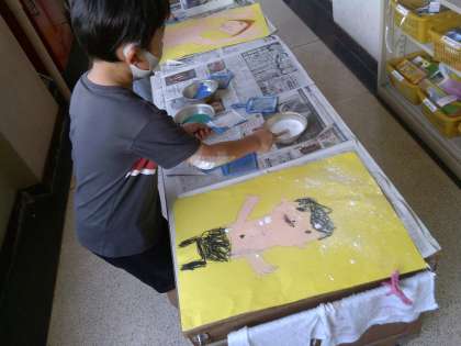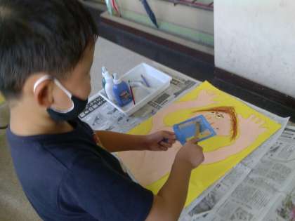 夏休み前から描いていたシャワーの絵が完成しました。仕上げは,絵の具を使って水しぶきをあらわしました。