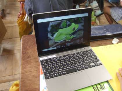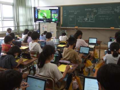 理科の授業では、モリアオガエルやツルレイシの観察のまとめをしています。調べ足りなかったところを再度調べたり、過去の写真を見直して書き加えたりして、どの児童もしっかりギガ端末を活用しています。検索したモリアオガエルの成体の写真を見て「かわいい!」と歓声が上がっていました。