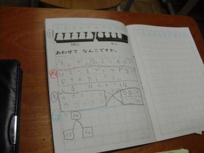 2学期になって「10よりおおきいかず」の学習をしています。10+4などの計算も,工夫して答えをだしています。