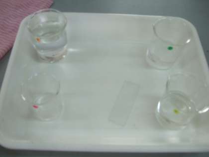 第一弾は、水溶液を熱したり、リトマス紙を使って何性か調べる活動を通して、子どもたちに水溶液を当ててもらおうということで、4種類の水溶液を用意しました。まずはリトマス紙を使って、酸性、中性、アルカリ性に分けたところで、特定できない水溶液について、さらに蒸発皿に入れて加熱しました。