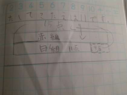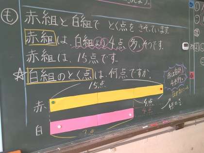 算数の「図をつかって考えよう」の学習の様子です。テープ図を描きながら,どちらが多いか少ないかをみんなで考えています。大切な言葉に注目して,一人学びも頑張っていました。