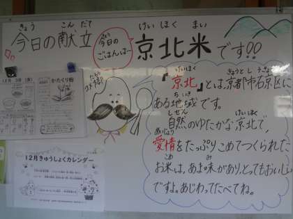 京都市右京区にある京北地域でとれた「京北米」は,もちもちとした食感でつややかでした。給食時間に「京北米」のムービーを見ながら,生産者の方のご苦労や思いを学びました。子どもたちは,いつもと違うお米に興味津々で,しっかりと味わって食べていました。「あまくておいしかったよ!」という声もたくさんあり,この日はごはんの残菜がいつもより少なかったです。